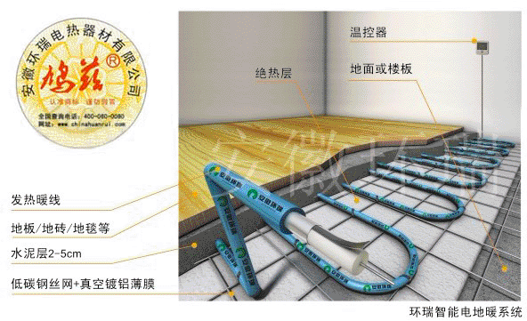 電地暖利用發(fā)熱電纜轉(zhuǎn)化為熱能,通過(guò)地表傳熱由下之上的地面輻射供暖系統(tǒng) 安徽環(huán)瑞電地暖廠家銷售電話:0551-67776888,傾力十年打造中國(guó)安全型電地暖品牌